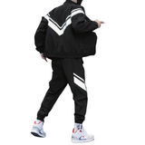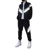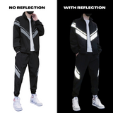 Our Black Tracksuit is low-key, until you don't want it to be. The Tracksuit is made out of the finest black polyester garments equipped with Reflective Stripes. Once the stripes reflect any kind of light, they come to life in a bright color mix between silver and white. It looks like this tracksuit from another dimension.