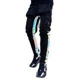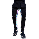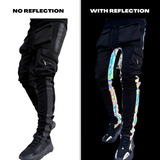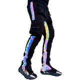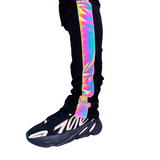 Our Cargo Pants are low-key until you don't want them to be. The Holographic Stripes are in a smooth grey, but when the holographic stripes reflect any kind of light, they come to life in all the colours of the rainbow, and it looks like they are from another dimension.