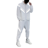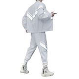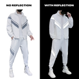 Our White Tracksuit is low-key, until you don't want it to be. The Tracksuit is made out of the finest white polyester garments equipped with Reflective Stripes. Once the stripes reflect any kind of light, they come to life in a bright color mix between silver and white. It looks like this tracksuit from another dimension.