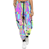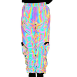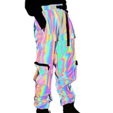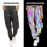 Our Holographic Cargo Pants are low-key until you don't want them to be. The Cargo Pants are in a smooth grey, but when they reflect any kind of light, they come to life in all the colours of the rainbow, and it looks like they are from another dimension.