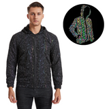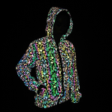 Our Holographic Jacket featuring our latest Shrooms Pattern is low-key until you don't want it to be. The Jacket is in a smooth grey. Once it reflects any kind of light, the Circuit Pattern comes to life in all the colours of the rainbow. It looks like it is from another dimension.