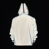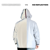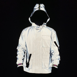 Our Reflective Techwear Jacket is low-key until you don't want it to be. The Techwear Jacket is in a smooth grey, but when it reflects any kind of light, it comes to life in a bright color mix between silver and white. It looks like it is from another dimension.
