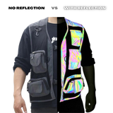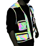 Our Holographic Techwear Vest is low-key until you don't want it to be. The Techwear Vest is in a smooth grey, but when it reflects any kind of light, it comes to life in all the colours of the rainbow, and it looks like it is from another dimension.