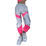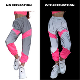 Our Reflective Pants are low-key until you don't want them to be. The Pants are made out of the finest pink polyester garment and with our added Reflective Parts which are in a smooth grey, but when they reflect any kind of light, they come to life in a bright color mix between silver and white. It looks like they are from another dimension.