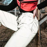 Our Reflective Pants are low-key until you don't want them to be. The Pants are in a smooth grey, but when they reflect any kind of light, they come to life in a bright color mix between silver and white. It looks like they are from another dimension.
