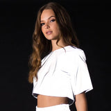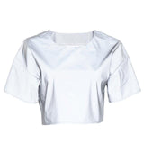 Our Reflective Crop Top is low-key until you don't want it to be. The Top is in a smooth grey, but when it reflects any kind of light, it comes to life in a bright color mix between silver and white. It looks like it is from another dimension.