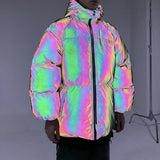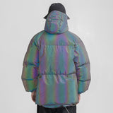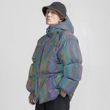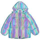 Our Puffer Holographic Jacket is low-key until you don't want it to be. The Puffer is in a smooth grey, but when it reflects any kind of light, it comes to life in all the colours of the rainbow, and it looks like it is from another dimension.