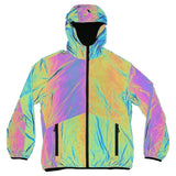 Our Holographic Jacket is low-key until you don't want it to be. The Jacket is in a smooth grey, but when it reflects any kind of light, it comes to life in all the colours of the rainbow, and it looks like it is from another dimension.